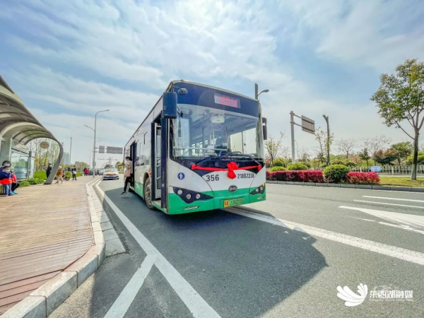 4月1日上午10时许,协和医院金银湖院区门口公交站台,一辆绿白相间、车头挂着红色彩带的356路公交车缓缓进站,正要返程的刘女士发现356路从自家门口延伸过来开心不已。