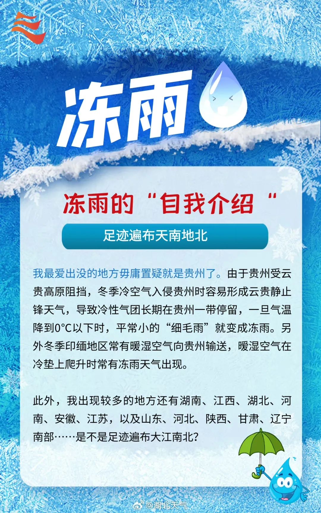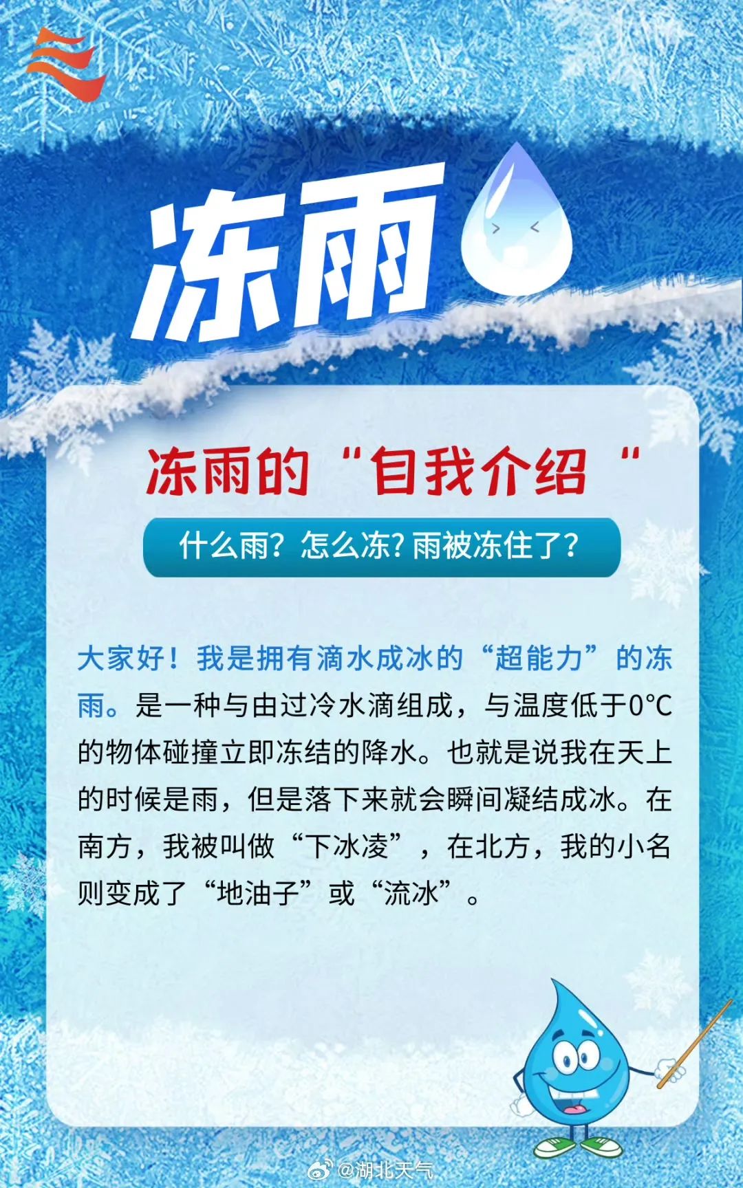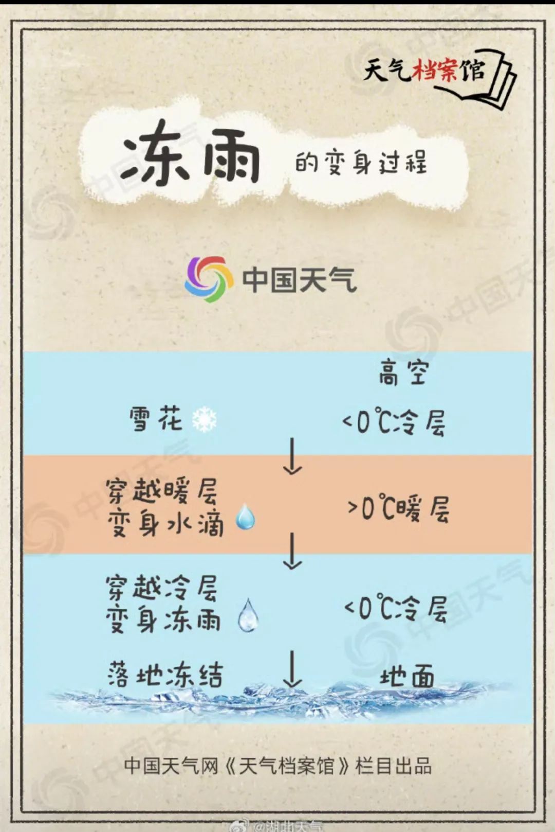 冻雨,过冷水也(指液态水在冰点以下不冻结的现象)。遇见0°C及以下的物体,滴水成冰!