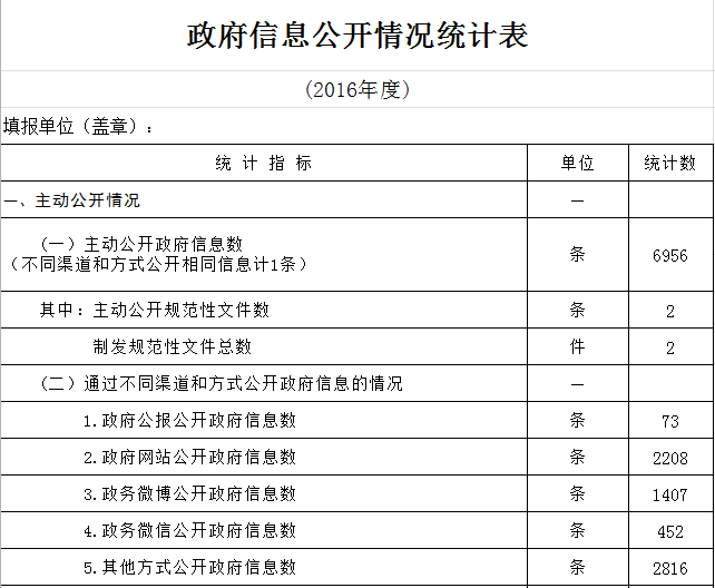 2016年,区政府依法向社会主动公开的政府信息共计6956条,其内容主要包括:政府文件、组织机构及职责、人事任免、政府实事、财政公开、政府采购、编制公开、规划公开、统计信息、重大项目、行政事项、行政收费、建设工程招投标、产权交易、土地储备、土地出让、房屋拆迁、道路建设、就业、社保、教育、医疗等22类信息。其中,通过政府公报向社会公开的政府信息73条,通过政府网站向社会公开的政府信息2208条,通过政府微博向社会公开的政府信息1407条,通过政府微信向社会公开的政府信息452条,通过其他方式公开政府信息数2816条。
