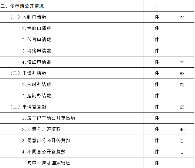 在受理政府信息公开申请中,我区严格按照《条例》要求的办理程序,及时规范办理。2016年,共受理依申请公开政府信息申请74件,均为信函申请,比去年增加825%,目前办结68件,延期办理6件。