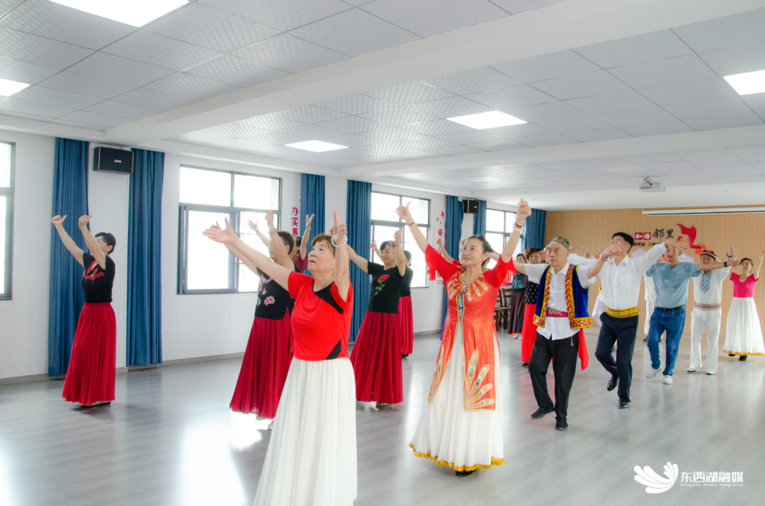 在四楼的舞蹈室,67岁的居民王满珍正和二十余名队友一道,在热情洋溢的新疆歌曲伴奏下翩翩起舞。起初,队伍只有十几人,没有合适的室内场地可供使用,大家只能在室外四处找空地。