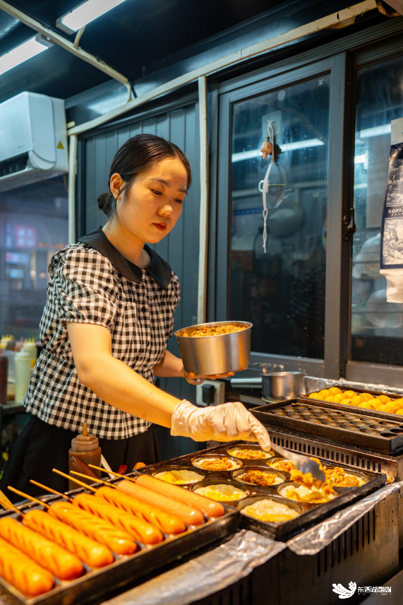 每当暮色降临,街区渐渐升腾起诱人的香气——酱香扑鼻的铁板鱿鱼、热气翻滚的麻辣烫、金黄饱满的锅盔、镬气十足的现炒饭……二十余种小吃汇聚成一条活色生香的味觉长廊,让人流连忘返。