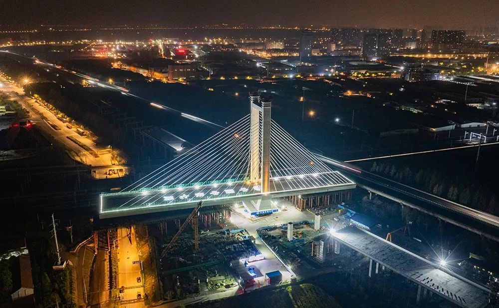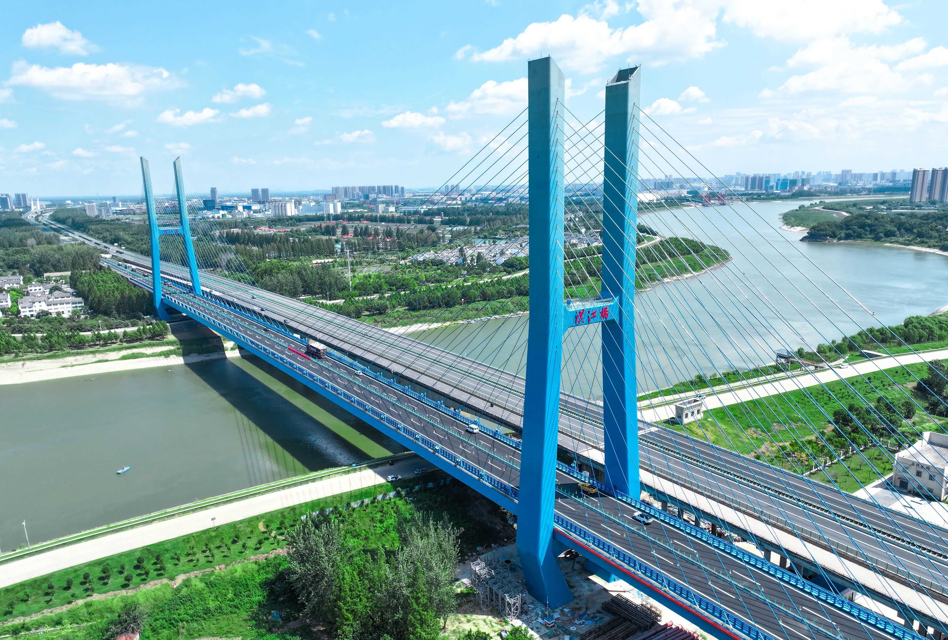 右幅汉江特大桥全长1667米,主跨为155+450+155米双塔双索面斜拉桥,主塔高123米,将承担8车道南下通行任务。