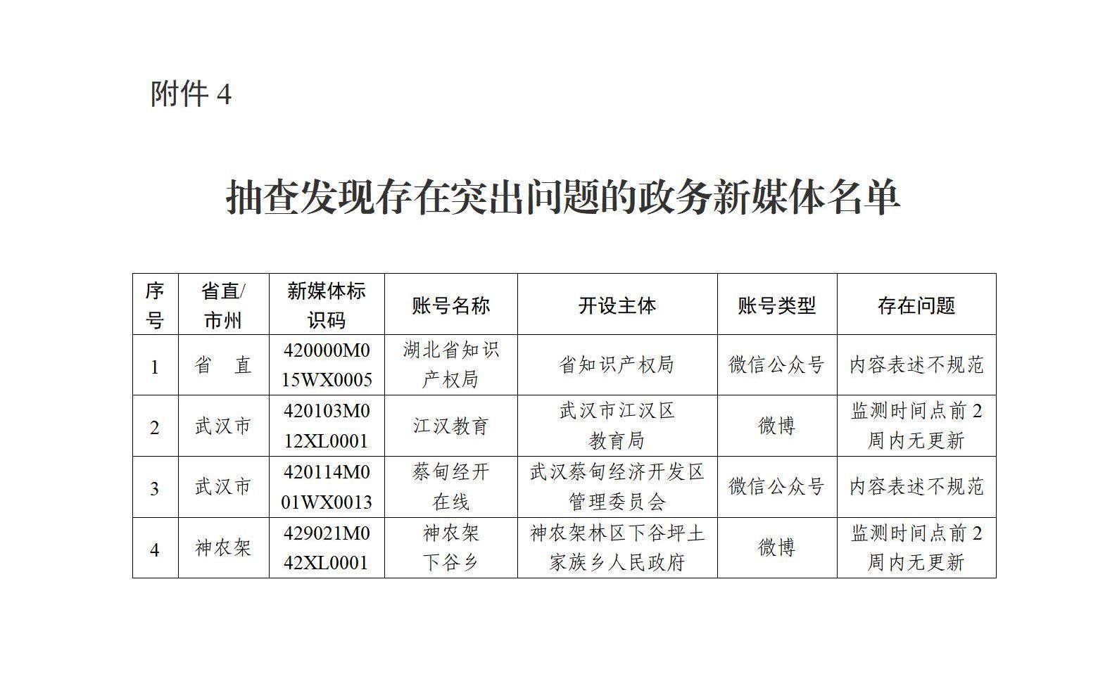(一)内容审核制度落实不严格。部分单位日常审核把关不严,如省住建厅网站、沙洋县人民政府门户网站、省知识产权局“湖北省知识产权局”微信公众号、武汉蔡甸经济开发区管理委员会“蔡甸经开在线”微信公众号,存在发布内容表述不规范问题。