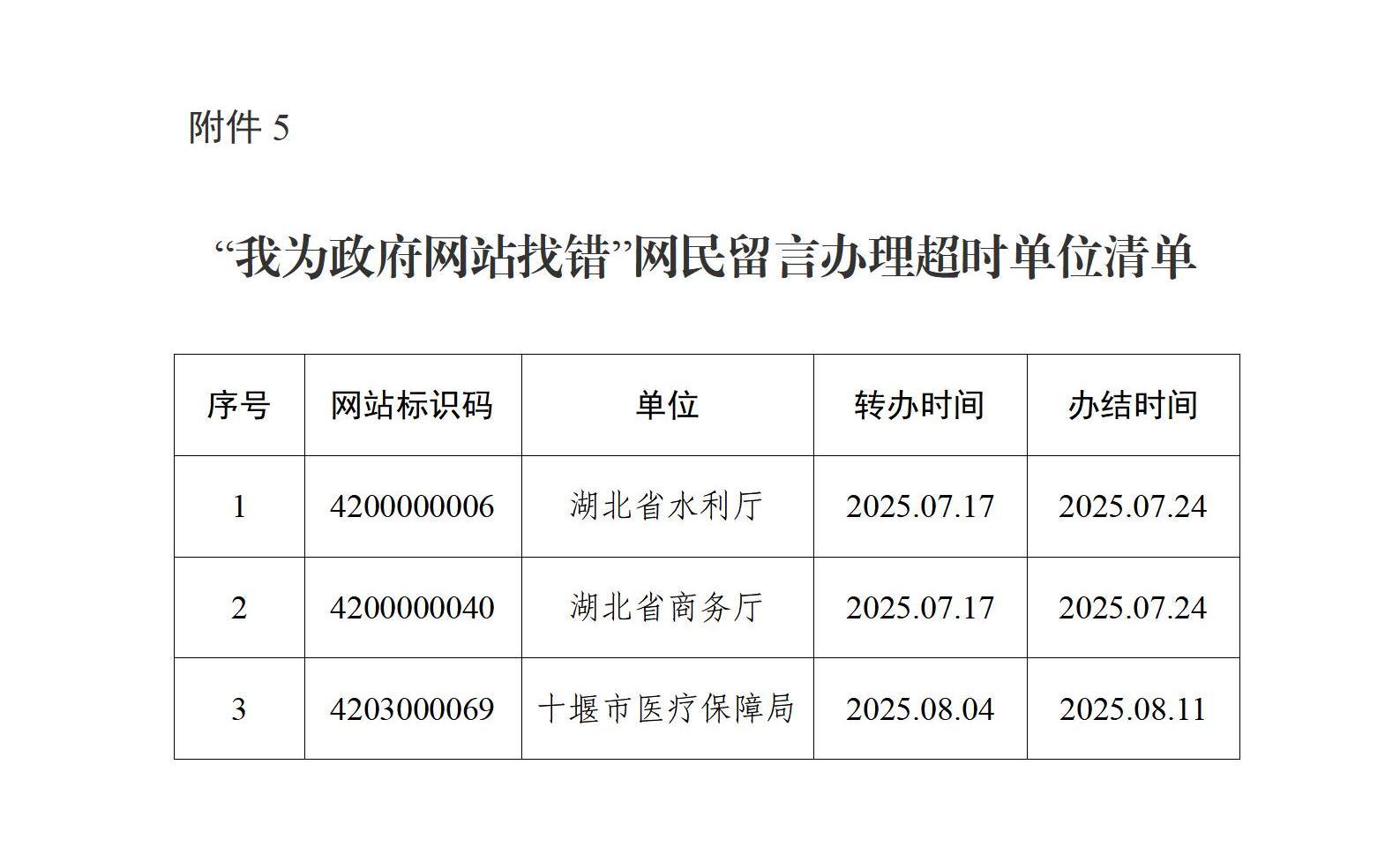 (三)监管要求落实不到位。省水利厅、省商务厅、十堰市医疗保障局等3家单位对“我为政府网站找错”网民留言办理工作重视不够,超出国务院办公厅要求的“三个工作日办结”时限办结。