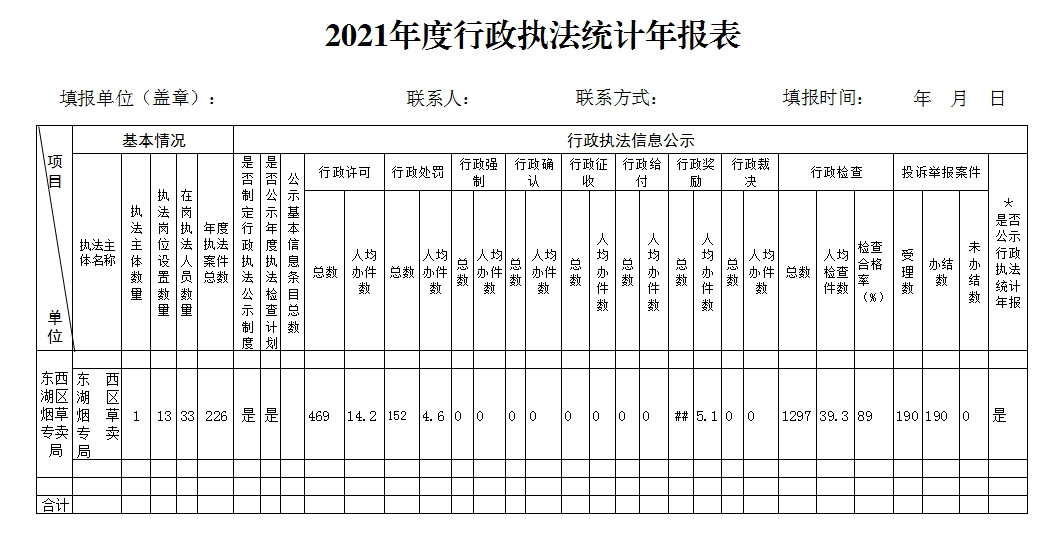 东西湖区烟草专卖局2021年度行政执法统计年报表