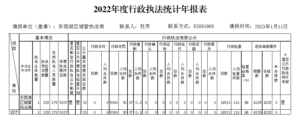2022年度东西湖区城管执法局行政执法统计年报表