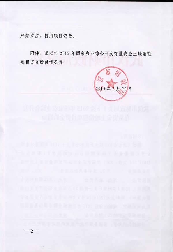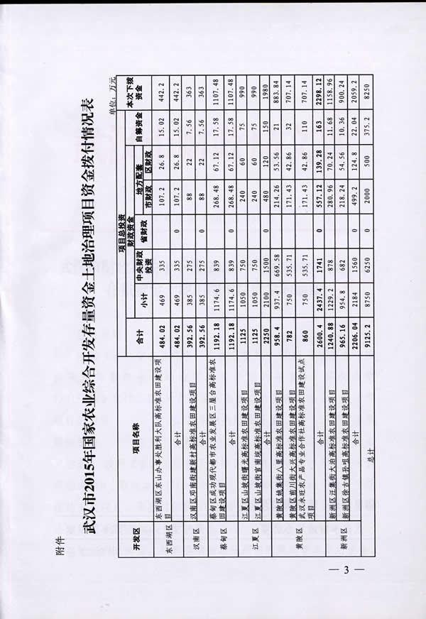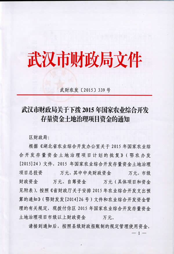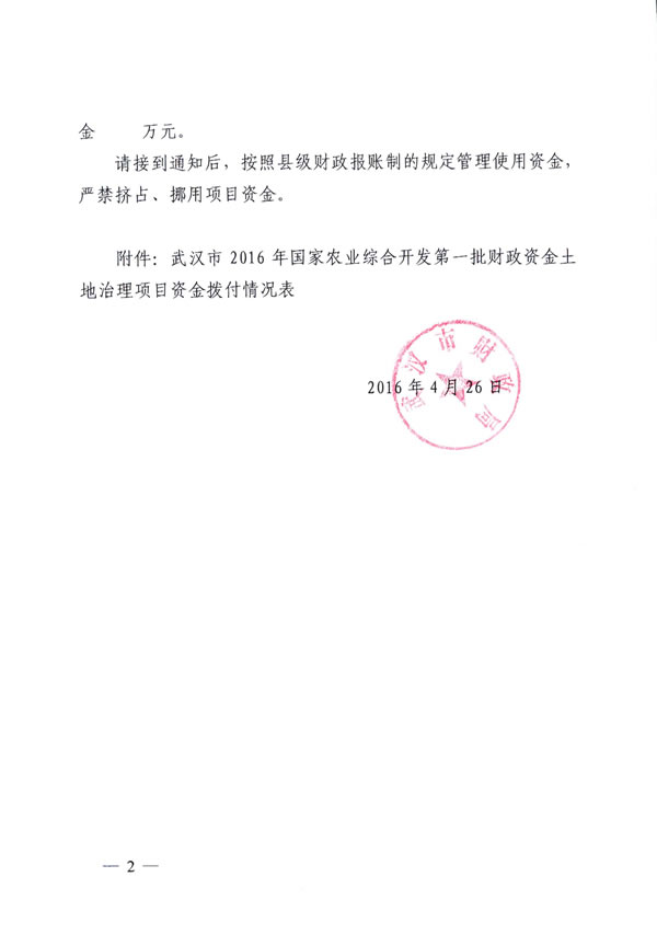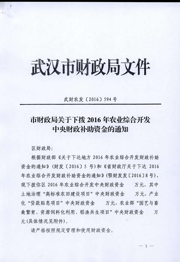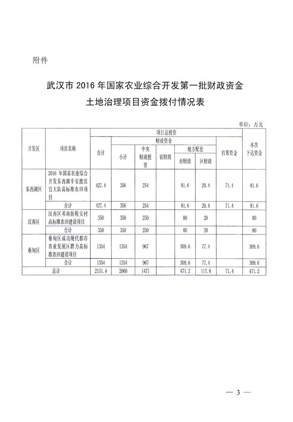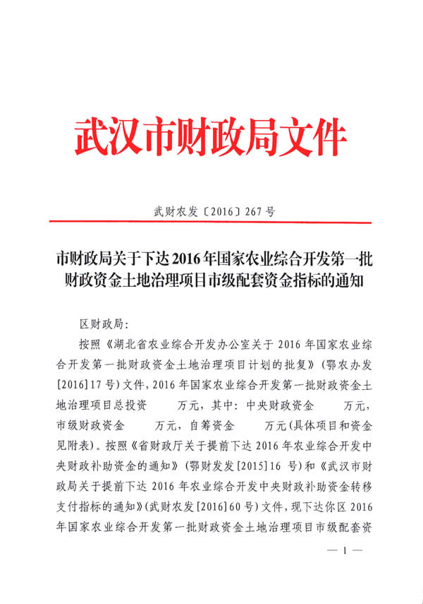 东西湖区2016年农业综合开发土地治理资金