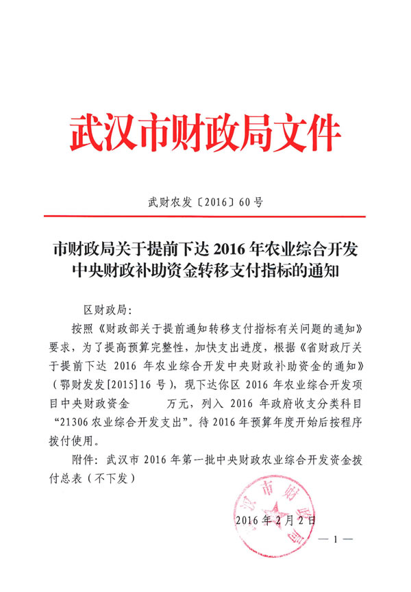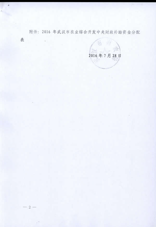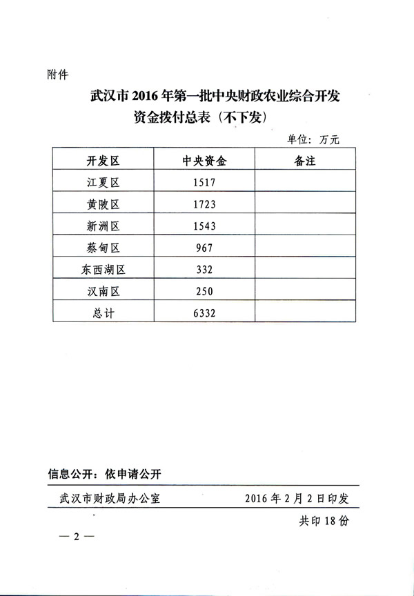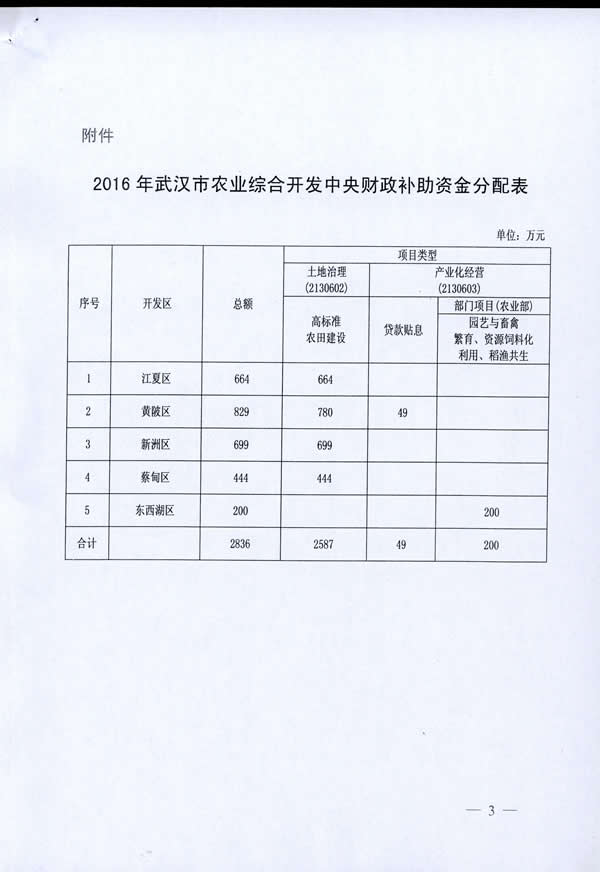 东西湖区2016年农业综合开发部门项目资金