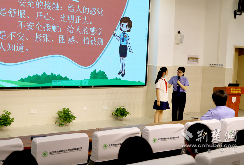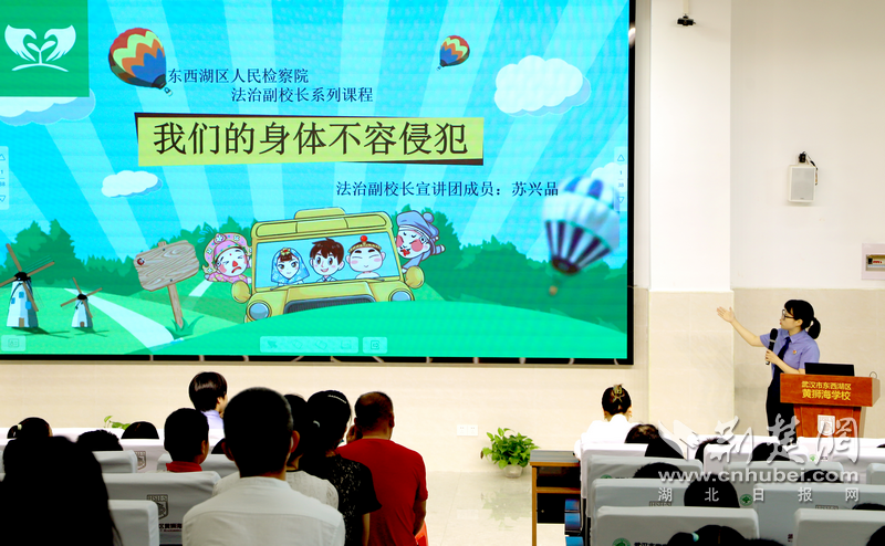荆楚网(湖北日报网)讯(记者齐一璇、许文秀 通讯员万晟)“眼睛擦亮,看清情况,千万别去危险的地方。夸我漂亮,让我帮忙,无故讨好,我才不上当。”6月9日,武汉市东西湖区黄狮海学校(常青树实验学校黄狮海校区)唱起《青春保护守则》。东西湖区检察院书记员、该校法制副校长苏兴品正用一曲“护卫春蕾”预防性侵主题MV,告诉男生女生,要学会保护自己,“修炼”远离侵害的“秘籍”。