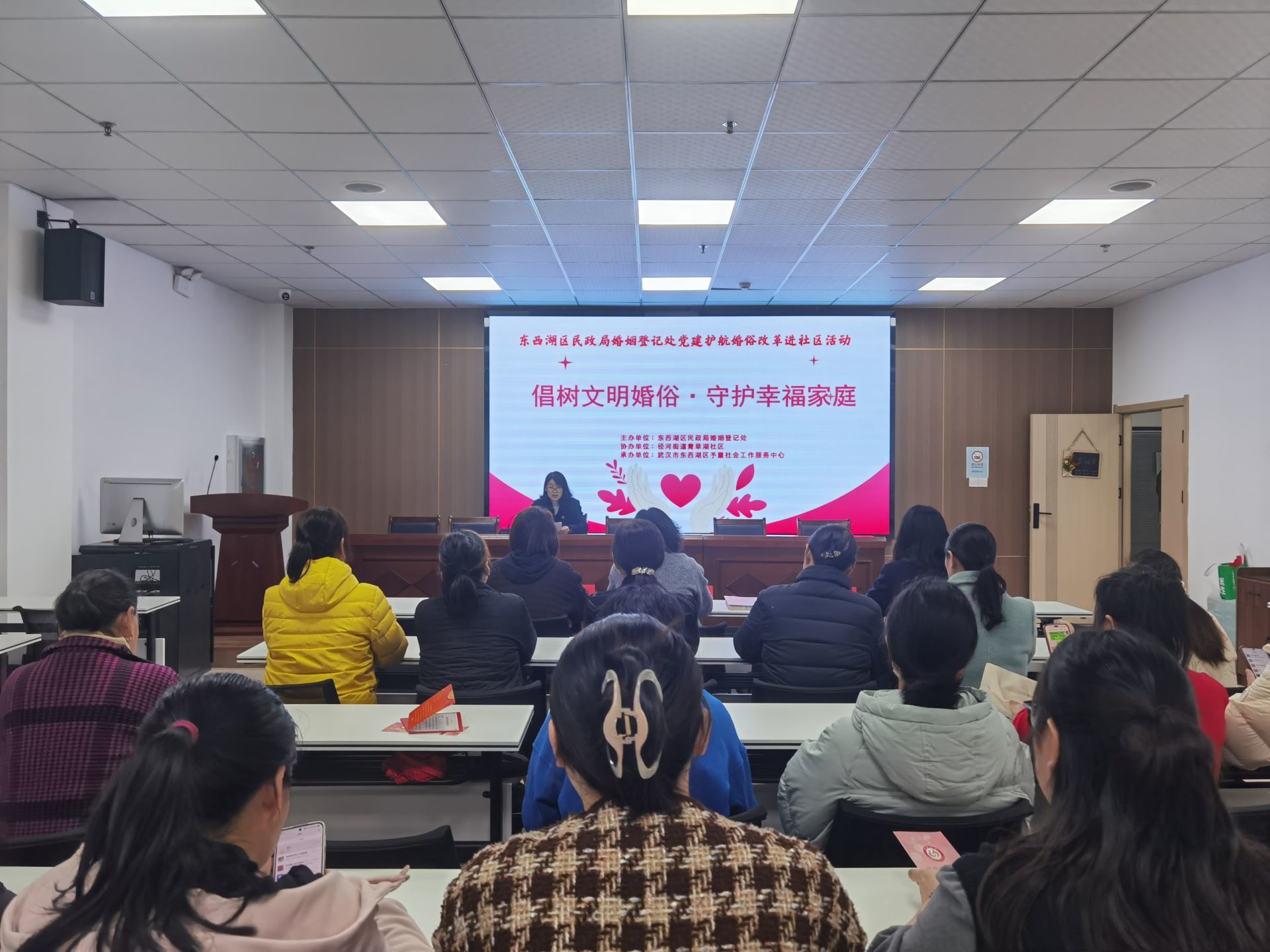 3月26日上午,东西湖区民政局婚姻登记处联合青草湖社区,成功开展“倡树文明婚俗·守护幸福家庭”党建护航婚俗改革进社区主题活动。活动通过“政策宣讲+家风培育+公益咨询+矛盾调解”四位一体的一站式服务模式,切实打通婚姻家庭服务“最后一公里”,以鲜红的党建底色引领淳朴的婚俗新风,用心守护万家幸福。