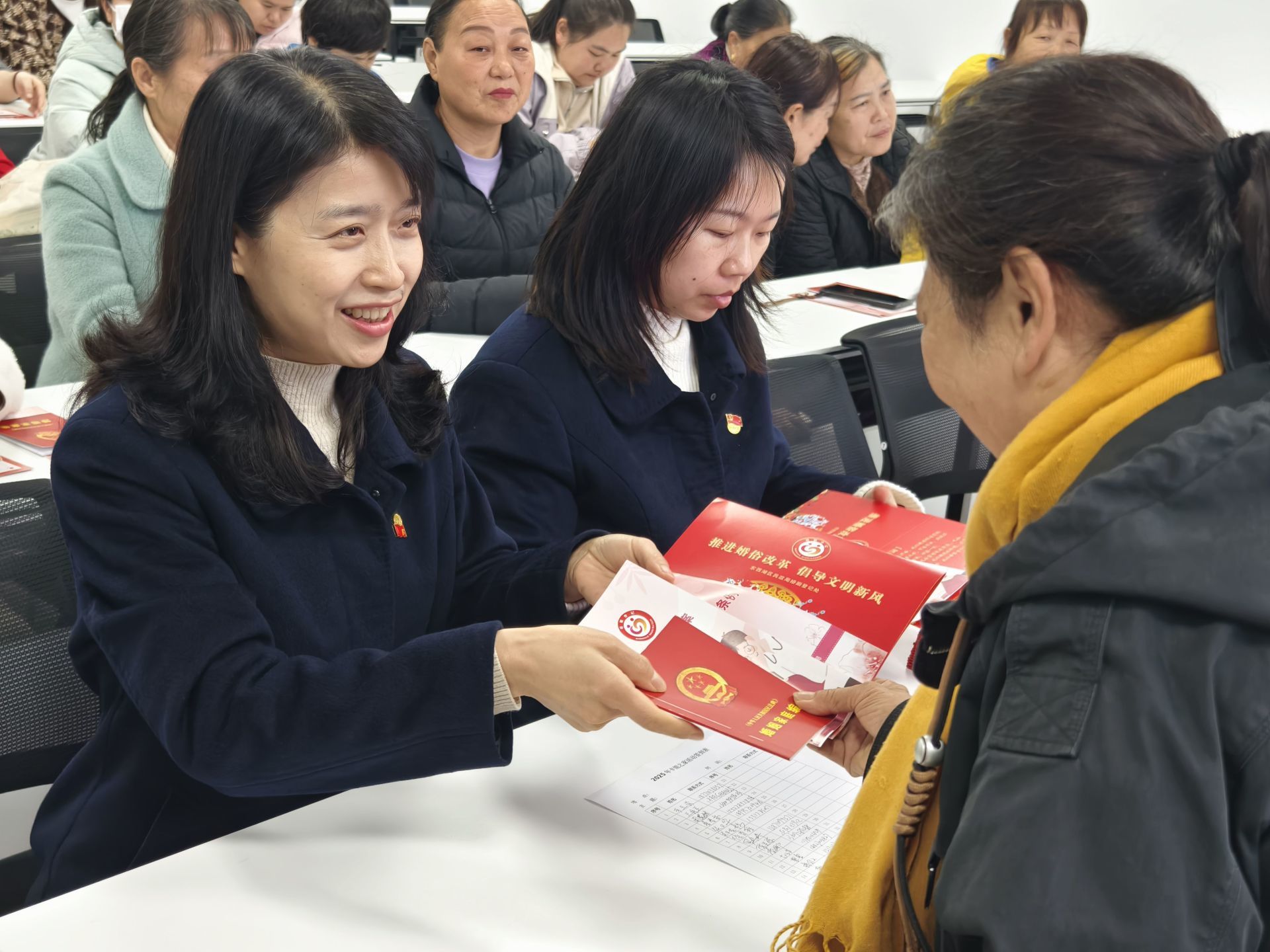 活动现场精心规划布局,设立签到引导、政策宣传、成果展示、私密咨询四大功能区。主题展板集中展示婚俗改革新政、婚姻法治知识与红色家风故事,各类宣传资料整齐排列、一目了然。上午9时30分,活动在热烈温馨的氛围中正式启动,居民群众在党员志愿者的引导下有序入场、主动参与,现场党群连心,共话文明新风。
