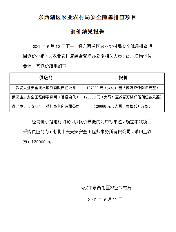 东西湖区农业农村局安全隐患排查项目询价结果报告