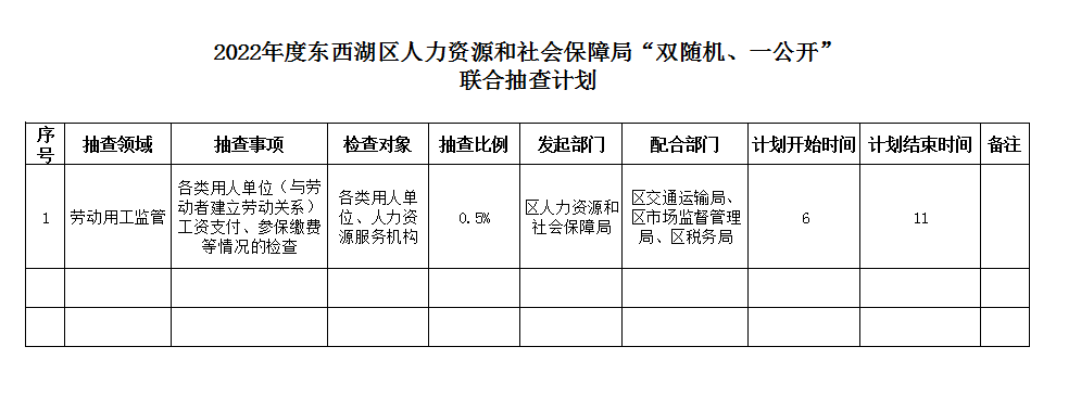 2022年度东西湖区人力资源和社会保障局“双随机、一公开”联合抽查计划