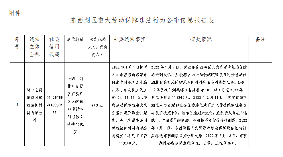 根据《重大劳动保障违法行为社会公布办法》(人社部令第29号)、《武汉市公共信用信息管理办法》(武汉市政府令272号)、《武汉市重大劳动保障违法行为社会公布暂行办法》相关规定,东西湖区人社局向社会公布2022年二季度1件重大劳动保障违法行为。