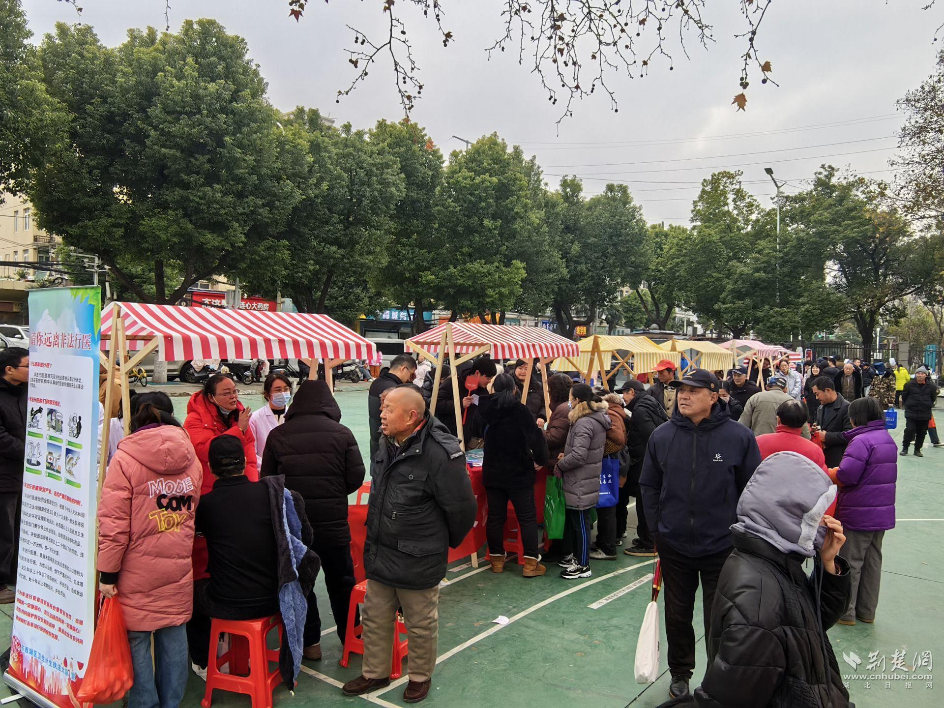 卫生健康宣传区设置宣传展板,以图文并茂的形式生动揭露非法行医的界定、危害及严重后果,提醒广大居民提高防范意识、远离非法行医;一旁的便民医疗服务摊位前,居民们有序排队,免费享受血压测量、血糖检测、中医把脉等贴心诊疗服务。
