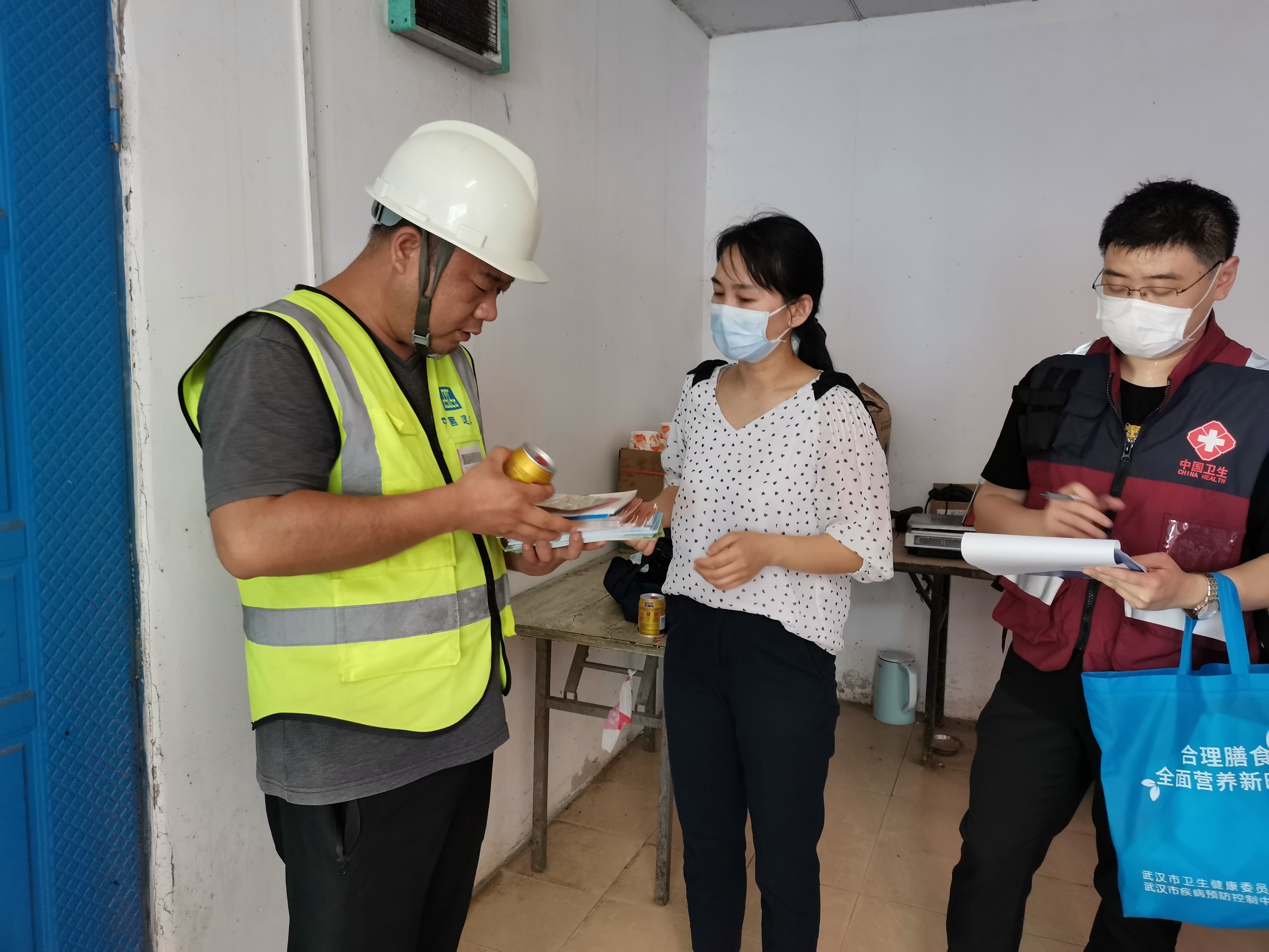 目前正处夏季高温时期,是食源性疾病及高温中暑高发季节。疾控工作人员在开展食品安全风险排查的同时向工地负责人强调了预防食源性疾病及高温中暑的重要性,要求工地给工人发放防暑降温用品,同时发放各类食品安全、食物中毒、高温中暑等相关防治知识折页和读本。要求工地负责人在开展施工安全生产培训的同时将食品安全,肠道传染病,食源性疾病的防治及预防高温中暑的相关知识进行培训和宣传。同时在每日晨检时注意询问是否有工人出现发热、腹泻、中暑等症状,一旦出现病例及时就医并上报。