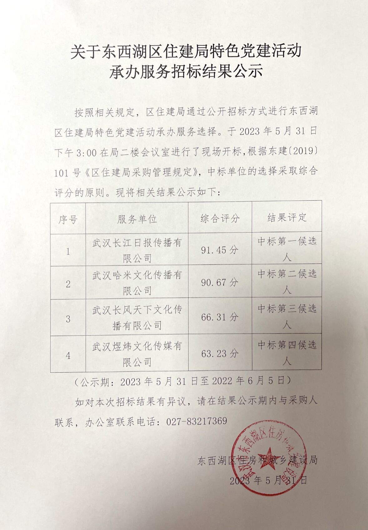 关于东西湖区住建局特色党建活动承办服务招标结果公示