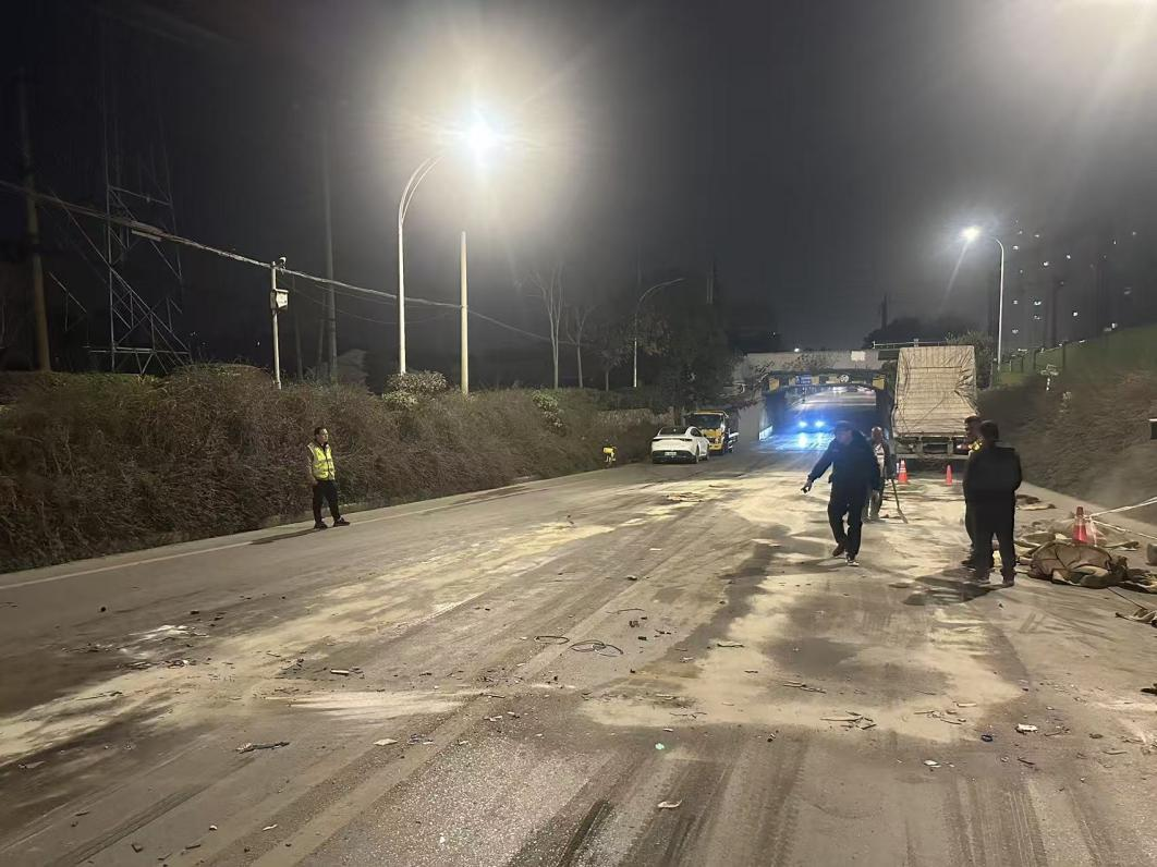 “师傅,前面路面有油,刚紧急处理了,请减速慢行!”随后,执法队员站在路边,有序引导过往车辆安全通行。他们还同步联系上限高架的权属单位,详细说明现场情况和设施损毁程度,督促其尽快维修,恢复设施功能。直到凌晨时分,现场基本稳定。考虑到深夜作业条件和安全,队员一致决定,次日一早联系环卫部门进行深度处理。