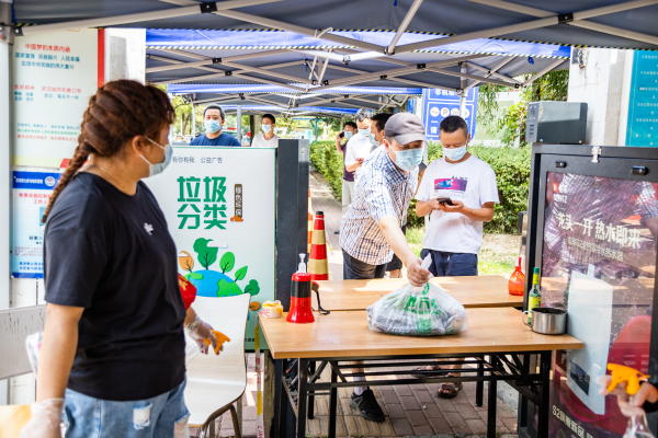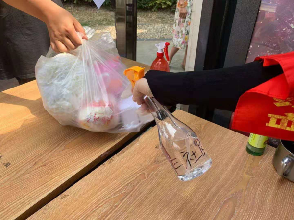 现场采用无接触配送方式进行配送。有配送人员与居民联络,待居民来到侧门边,配送人员便将相应包裹放在侧门口的桌子上,一旁的工作人员对配送人员与配送货品进行全面消毒后,居民便可将货品带走。