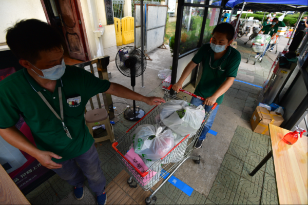 邮政快递增派了8名党员前来现场协助配送,他们介绍,近两日,常青花园四小区的快递量增加了40%,主要货物为米、油、牛奶、方便面等物资。