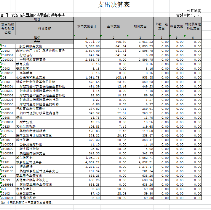 将军路街道办事处2015年度本年支出合计 9764.69万元。其中:基本支出 798.40万元,占本年支出 8 %,项目支出8966.23 万元,占本年支出92 %,上缴上级支出 0 万元,占本年支出0 %,经营支出0 万元,占本年支出 0 %,对附属单位补助支出 0万元,占本年支出0 %。