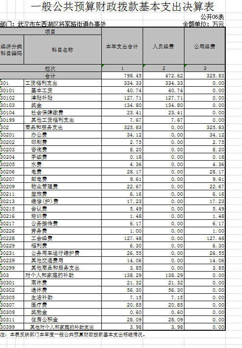 将军路街道办事处2015度一般公共预算财政拨款基本支出 798.4 万元,其中,人员经费 472.6 万元,主要包括:基本工资、津贴补贴、奖金、社会保障缴费、伙食补助费、绩效工资、其他工资福利支出、离休费、退休费、抚恤金、退职(役)费、抚恤金、生活补助、医疗费、助学金、资励金、住房公积金、提租补贴、购房补贴、其他对个人和家庭的补助支出;公用经费 325.8 万元,主要包括:办公费、印刷费、咨询费、手续费、水费、电费、邮电费、取暖费、物业管理费、差旅费、因公出国(境)费、专用维修(护)费、租赁费、会议费、培训费、公务接待费、专用材料费、被装购置费、专用燃料费、劳务费、委托业务费、工会经费、福利费、公务用车运行维护费、其他交通费用、税金及附加费用、其他商品和服务支出、办公设备购置、专用设备购置、信息网络及软件购置更新、其他资本性支出。