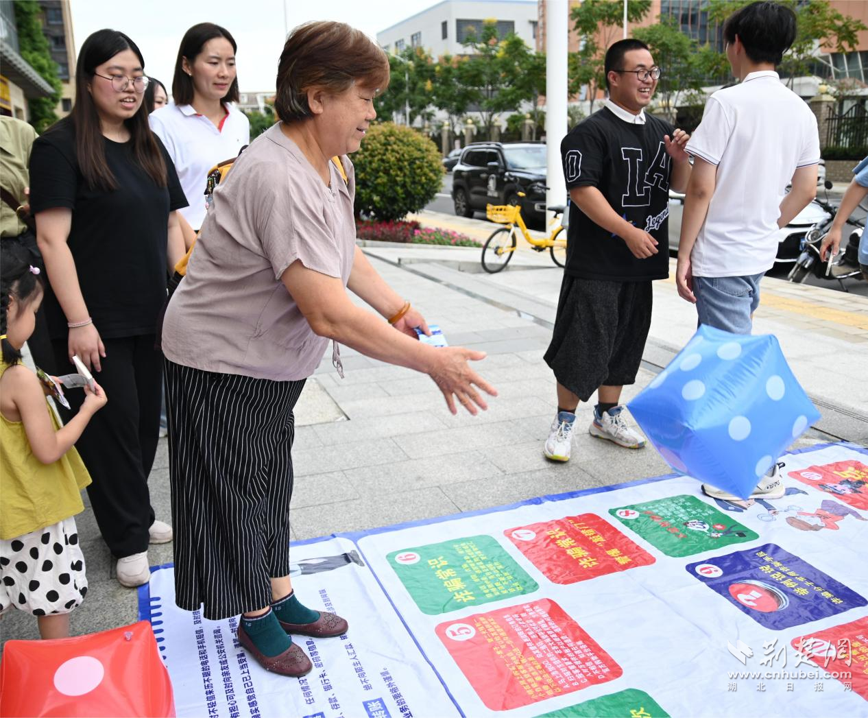 活动现场设置的飞行棋游戏吸引了小朋友和老人们的热情参与。参与者从棋盘起点出发,根据投掷的骰子数前进相应步数,并回答所在“关卡”的防诈骗方面的问题,回答正确才能进入下一“关卡”,最终抵达终点者将会获得一份奖品。