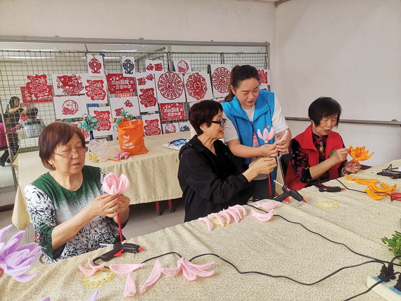 志愿者教居民做手工莲花。图片来源:吴家山街道办事处