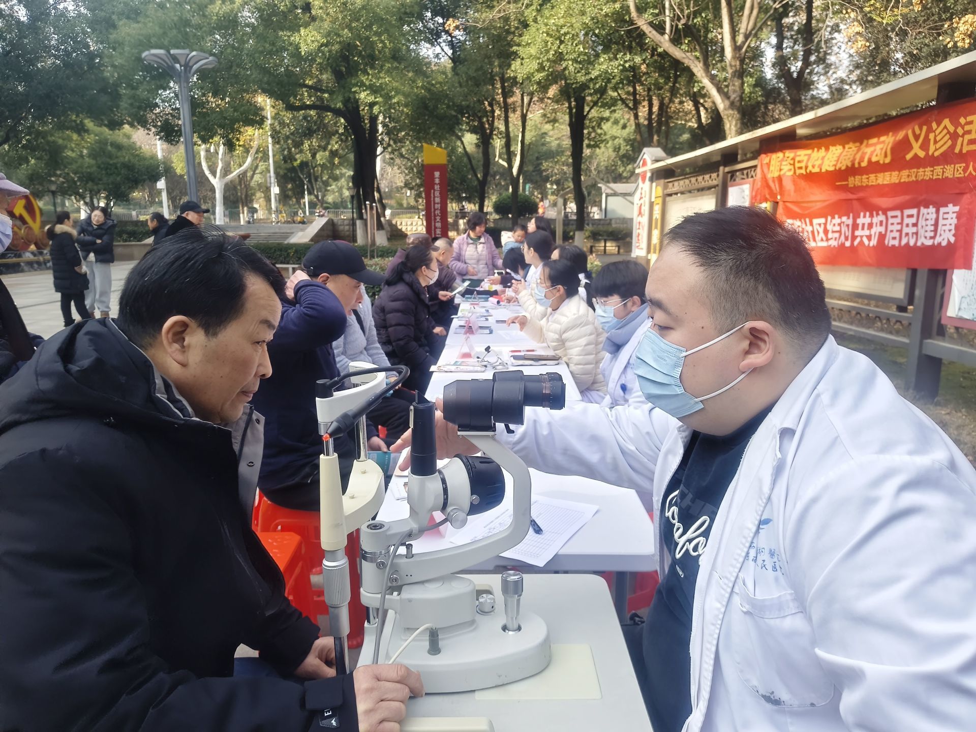 活动现场分工明确、秩序井然,两大服务区域同步推进,让居民实现“一站式”便捷体验。在义诊服务区,东西湖区人民医院组建专业医疗团队,涵盖老年科、呼吸内科、康复医学科、介入血管外科、眼科五大重点科室,精准对接居民日常健康痛点。老年科医生为高龄居民提供慢性病管理指导,呼吸内科针对咳嗽、哮喘等呼吸道问题答疑解惑,康复医学科为颈肩腰腿痛患者提供个性化康复方案,介入血管外科开展血管疾病筛查,眼科则通过裂隙灯检查排查常见眼病。