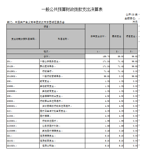 团区委2015年一般公共预算财政拨款支出年度预算为190万元(包括年初部门预算、基本建设等专项资金、上级下达的专项转移支付资金及年初结转和结余资金等支出),支出决算为190万元,完成年度预算的100%。其中:基本支出90万元,项目支出100万元。项目支出主要为青教辅导员(配套)经费1.8万元,主要成效是培训青少年社会教育辅导员;五四活动费3万元,用于五四青年节开展活动;少先队活动费2万元,用于组织全区少先队开展活动;青少年活动中心运营费10.5万元,用于东西湖区青少年社会教育活动指导中心正常运行;青年志愿者活动费8万元,用于组织开展青年志愿者活动;关工委活动费12万元,用于关心下一代工作委员会开展活动,青联换届费10万元,用于召开第二届青联大会;青联活动费1万元,用于区青年联合会开展活动等;未成年人保委会工作经费2万元,用于未保委日常开展工作;青少年系列活动费49.5万元,用于开展青少年系列活动。