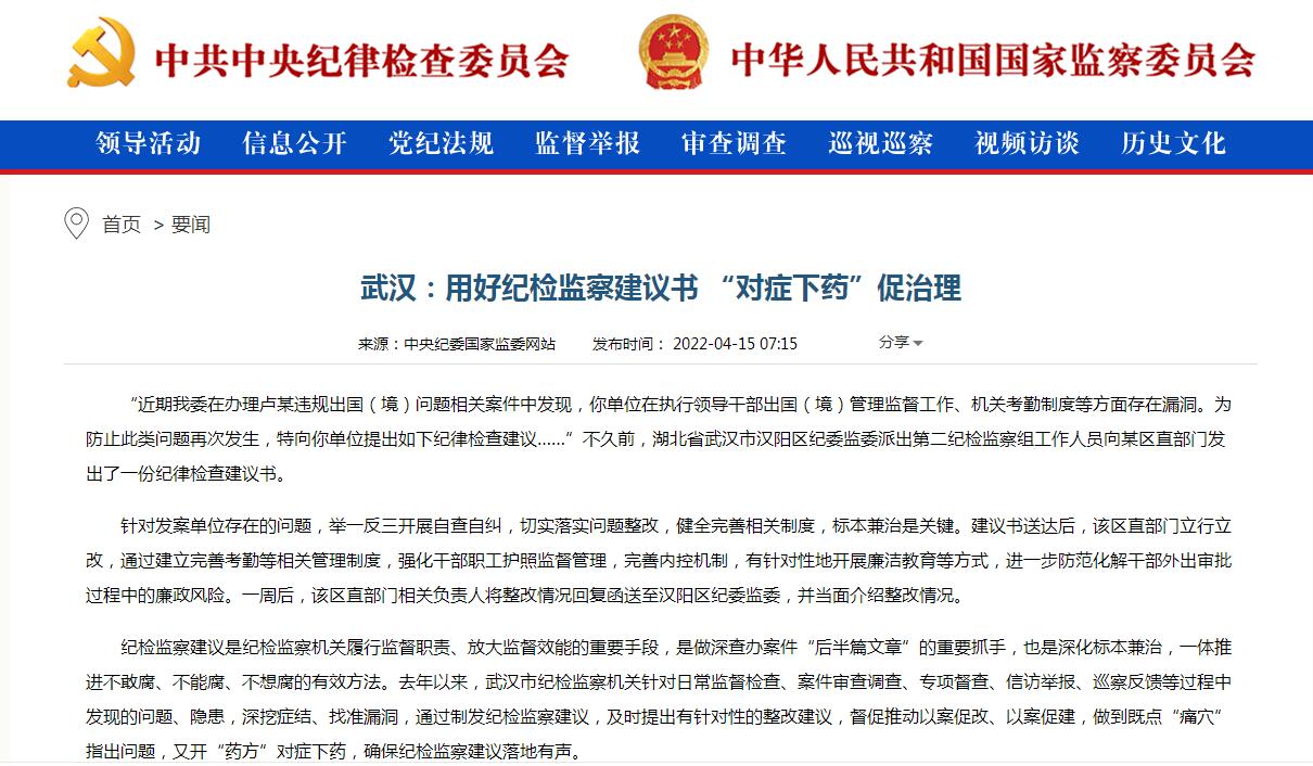“近期我委在办理卢某违规出国(境)问题相关案件中发现,你单位在执行领导干部出国(境)管理监督工作、机关考勤制度等方面存在漏洞。为防止此类问题再次发生,特向你单位提出如下纪律检查建议……”不久前,湖北省武汉市汉阳区纪委监委派出第二纪检监察组工作人员向某区直部门发出了一份纪律检查建议书。