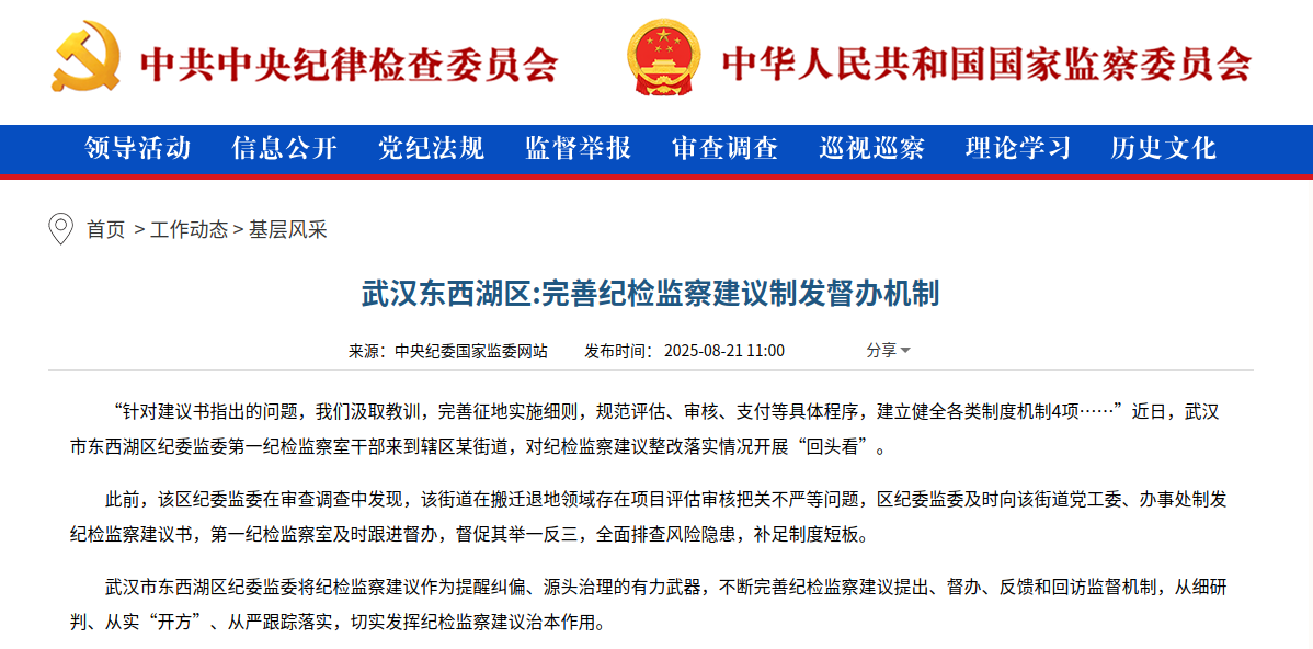 武汉市东西湖区纪委监委将纪检监察建议作为提醒纠偏、源头治理的有力武器,不断完善纪检监察建议提出、督办、反馈和回访监督机制,从细研判、从实“开方”、从严跟踪落实,切实发挥纪检监察建议治本作用。