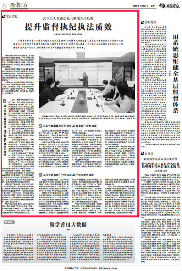 以数据智能助力提升监督效能。按照“市区联动、数据共享、安全高效”工作思路,全市各级纪检监察机关突出抓好大数据监督建模工作。同时,深入开展业务培训,加强数据分析、大数据建模、人工智能应用等内容的学习交流;选派业务骨干跟案学习,强化技术应用,让更多的纪检监察干部会用、善用大数据。