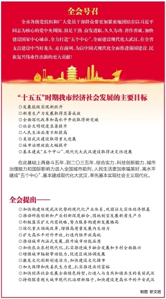 全会强调,汇聚高质量发展强大合力,为实现“十五五”规划目标而努力奋斗。持之以恒推进全面从严治党,增强党的政治领导力、思想引领力、群众组织力、社会号召力,提高党领导经济社会发展能力和水平,为建设现代化大武汉凝聚磅礴力量。要坚持党的全面领导,加强民主法治建设,推动规划制定落实。
