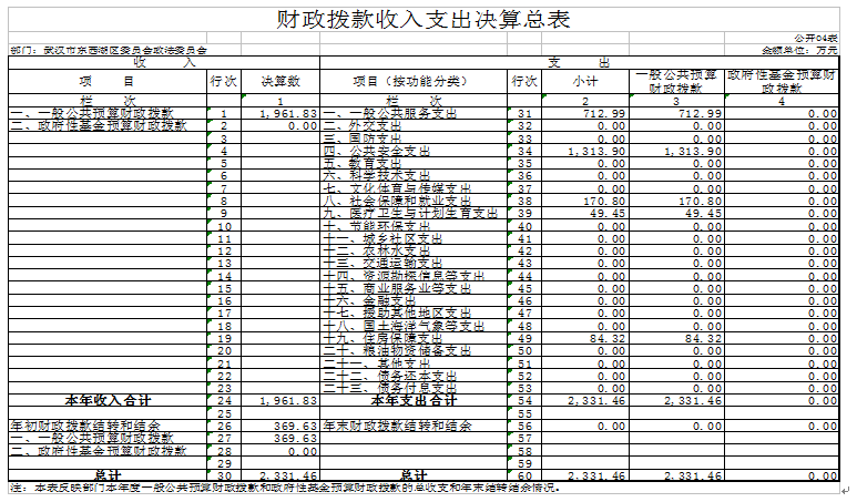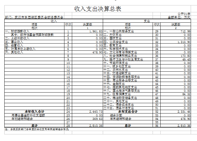 武汉市东西湖区委员会政法委员会2015年度收入总计2440.7万元,支出总计 2331 万元。与2014年相比,收入增9% 。支出增 7 %。主要原因是各项专项经费有不同程度的增加,社工及事业人员的工资福利也相应增长并纳入了预算。