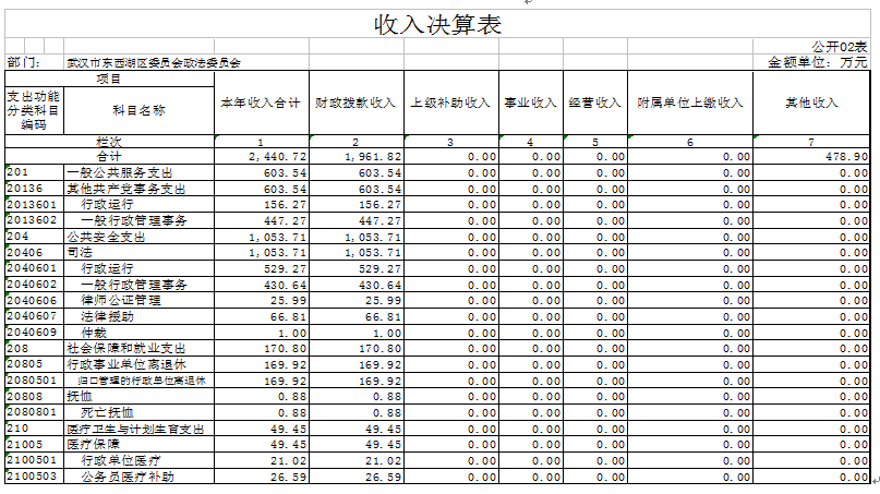 武汉市东西湖区委员会政法委员会2015年度本年收入合计2440.7万元。其中:财政拨款收入(含政府性基金拨款) 1961.8万元,占本年收入 80.4 %,其他收入 478.9万元,占本年收入 19.6%。