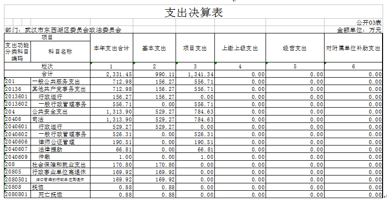 武汉市东西湖区委员会政法委员会2015年度本年支出合计 2331 万元。其中:基本支出 990 万元,占本年支出42.47 %,项目支出1341万元,占本年支出 57.53 %。