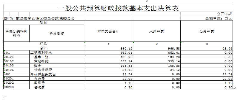 武汉市东西湖区委员会政法委员会2015度一般公共预算财政拨款基本支出990万元,其中,人员经费 966 万元,主要包括:基本工资、津贴补贴、奖金、社会保障缴费、伙食补助费、绩效工资、其他工资福利支出、离休费、退休费、抚恤金、退职(役)费、抚恤金、生活补助、医疗费、助学金、资励金、住房公积金、提租补贴、购房补贴、其他对个人和家庭的补助支出;公用经费24万元,主要包括:办公费、印刷费、咨询费、手续费、水费、电费、邮电费、取暖费、物业管理费、差旅费、因公出国(境)费、专用维修(护)费、租赁费、会议费、培训费、公务接待费、专用材料费、被装购置费、专用燃料费、劳务费、委托业务费、工会经费、福利费、公务用车运行维护费、其他交通费用、税金及附加费用、其他商品和服务支出、办公设备购置、专用设备购置、信息网络及软件购置更新、其他资本性支出。