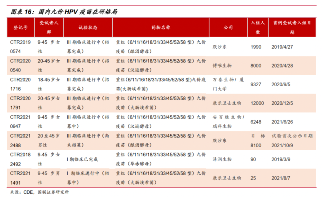 沃森生物介绍,子公司上海泽润九价HPV疫苗处于临床研究阶段,目前该疫苗正在开展Ⅲ期临床研究受试者入组前的相关准备工作;万泰生物半年报提到,其九价HPV疫苗 III 期临床试验和产业化放大进展顺利,与默沙东九价疫苗的头对头临床试验已完成临床试验现场及标本检测工作,正在进行数据统计分析,小年龄桥接临床试验完成入组工作,已完成商业化生产车间建设,正在进行产业化放大生产研究;瑞科生物(2179.HK)的核心产品也是一款重组HPV九价候选疫苗,目前正在中国进行III期临床试验。