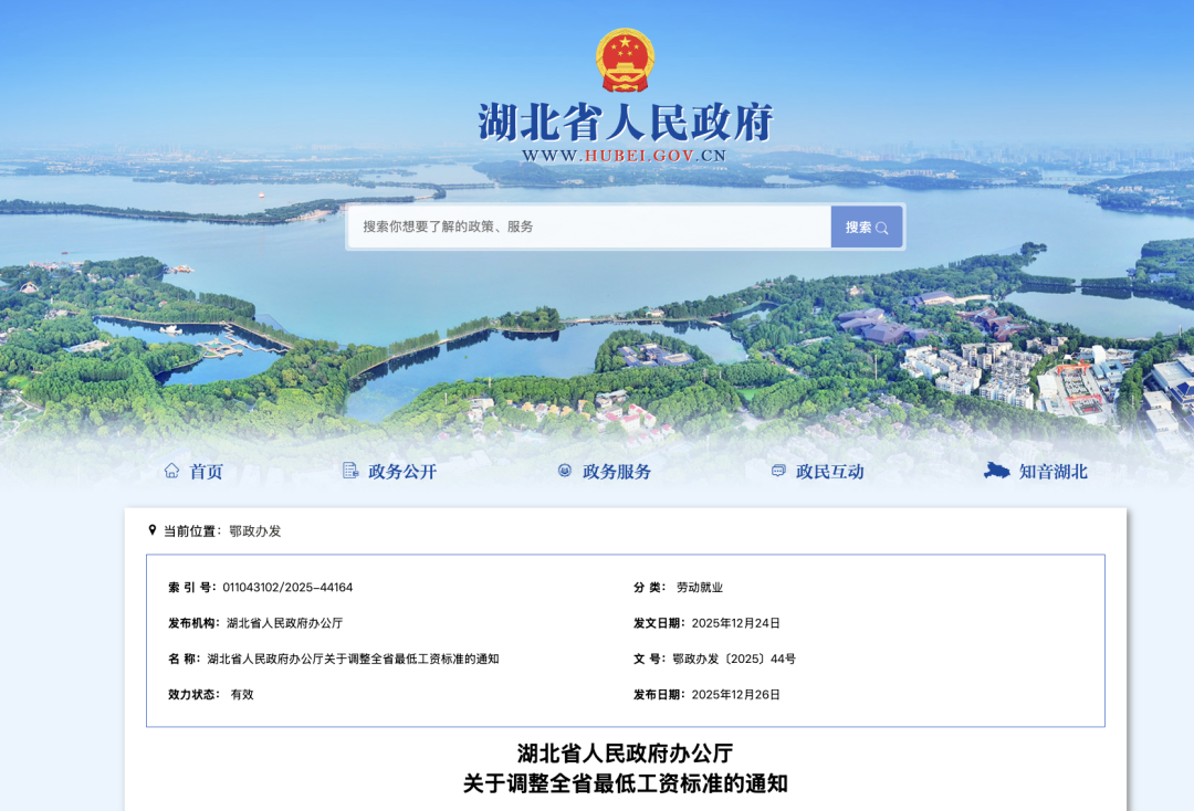 12月26日,湖北省人民政府官网发布《湖北省人民政府办公厅关于调整全省最低工资标准的通知》,湖北省最低工资标准2025年12月1日起调整。